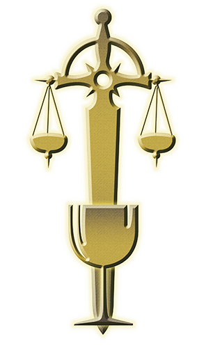 Ein Schwert, die Trennlinie zwischen Licht und Dunkelheit sowie die Waagschalen der Gerechtigkeit bilden zusammen das Glaubensymbol, die heilige Schwertwaage.